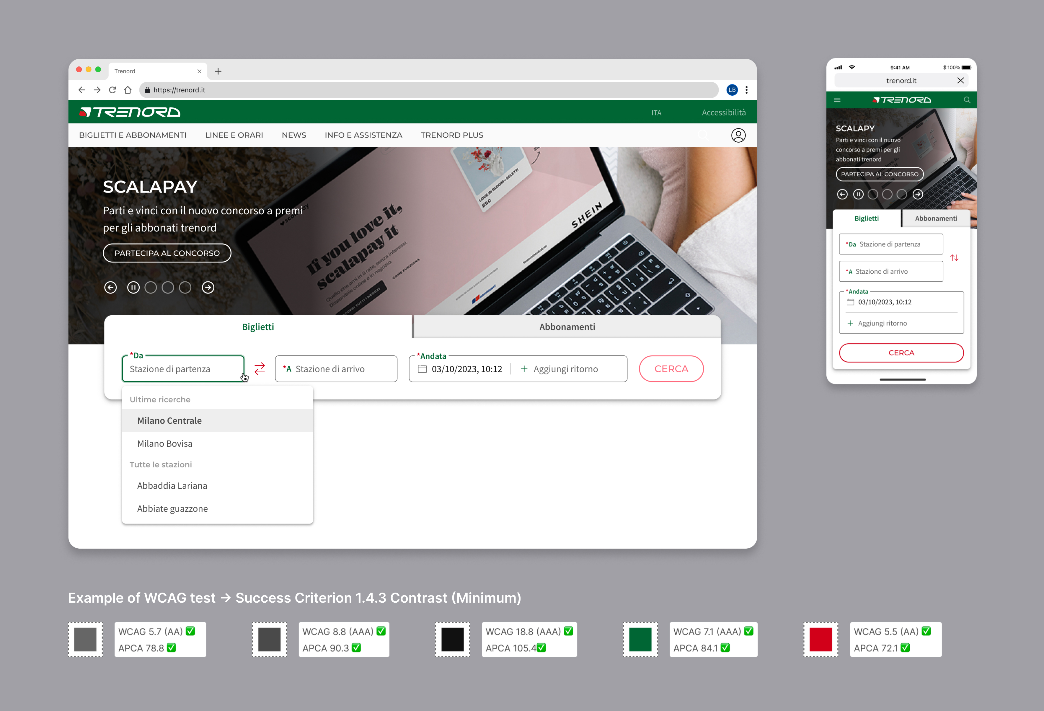 Over the past few months, I've been studying the WCAG guidelines, ensuring that the typography, colors, and all the new components of the Trenord widget I designed would have met the accessibility standards. Through a deep research, iteration, and focusing on mobile-first design we've crafted an accessible, consistent and optimal user experience regardless of the device used. It's crucial to highlight how much in 2024 it's important for designers to produce accessible and inclusive artifacts guaranteeing a better experience for users with disabilities and enhancing a smoother and intuitive one for everyone.